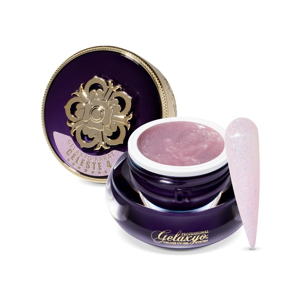 Gel Cover Autonivelant Gelaxyo Celeste 4 este un gel cover profesional, in nuanta naturala, roz violet, cu sclipici fin argintiu si irizatii multicolore!
