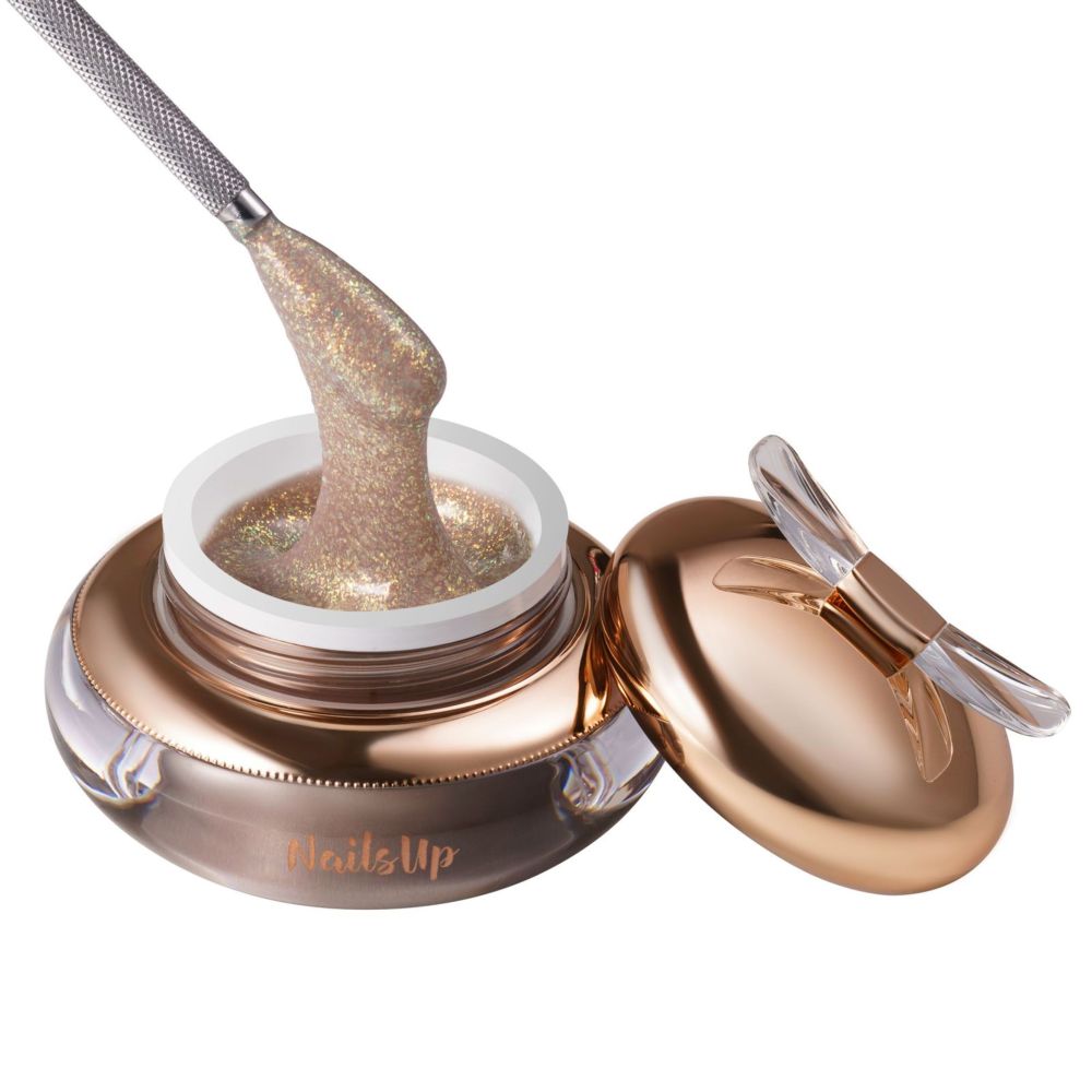 Iubesc gama Golden Glow, dar nuanta asta nu e pământească!! Gel autonivelant, aplicare ușoară, aproape ca face toată treaba singur. Se poate folosi atat în tehnica fără pilire, cât și în tipsurile reutilizabile. Și rezista super bine, în ciuda faptului ca are atat de multe paietute, care btw, nu încurcă în niciun fel aplicarea uniforma.