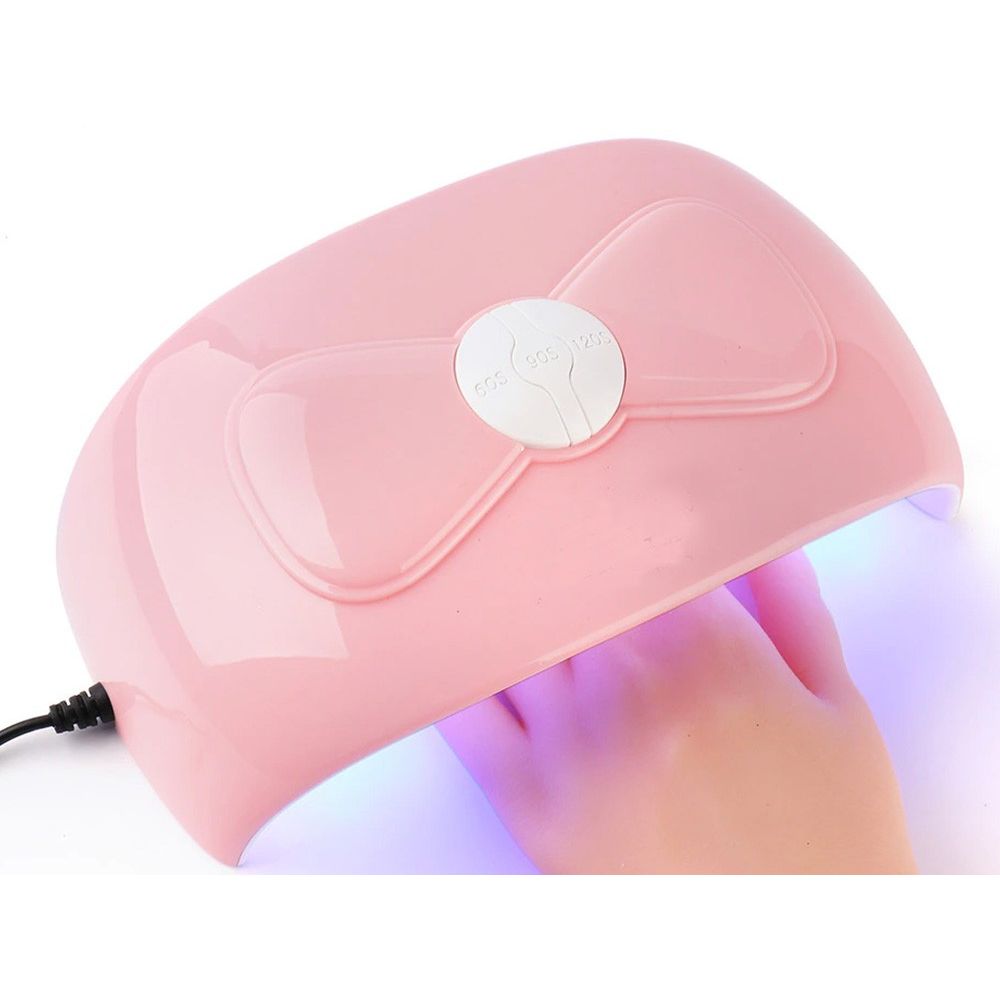 Lampa Unghii UV LED 54W, 18 LED, Uscare rapida, Incarcare USB este solutia perfecta pentru a polimeriza manichiura tehnica! Forma de fundita pe care o are o face foarte atractiva, mai ales ca butoanele timerului sunt in mijloc, in cercul funditei!