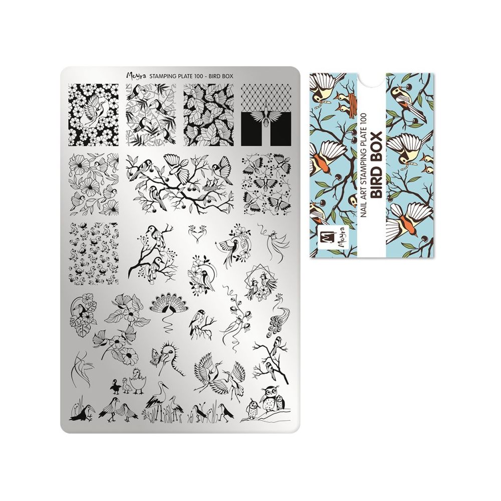 Matrita pentru stampila nr 100 - Bird Box este un accesoriu folosit in arta unghiilor pentru a crea diverse modele si desene pe unghii. Aceasta matrice este realizata din otel si are modele gravate in ea, care pot fi transferate pe unghii cu ajutorul stampilei.