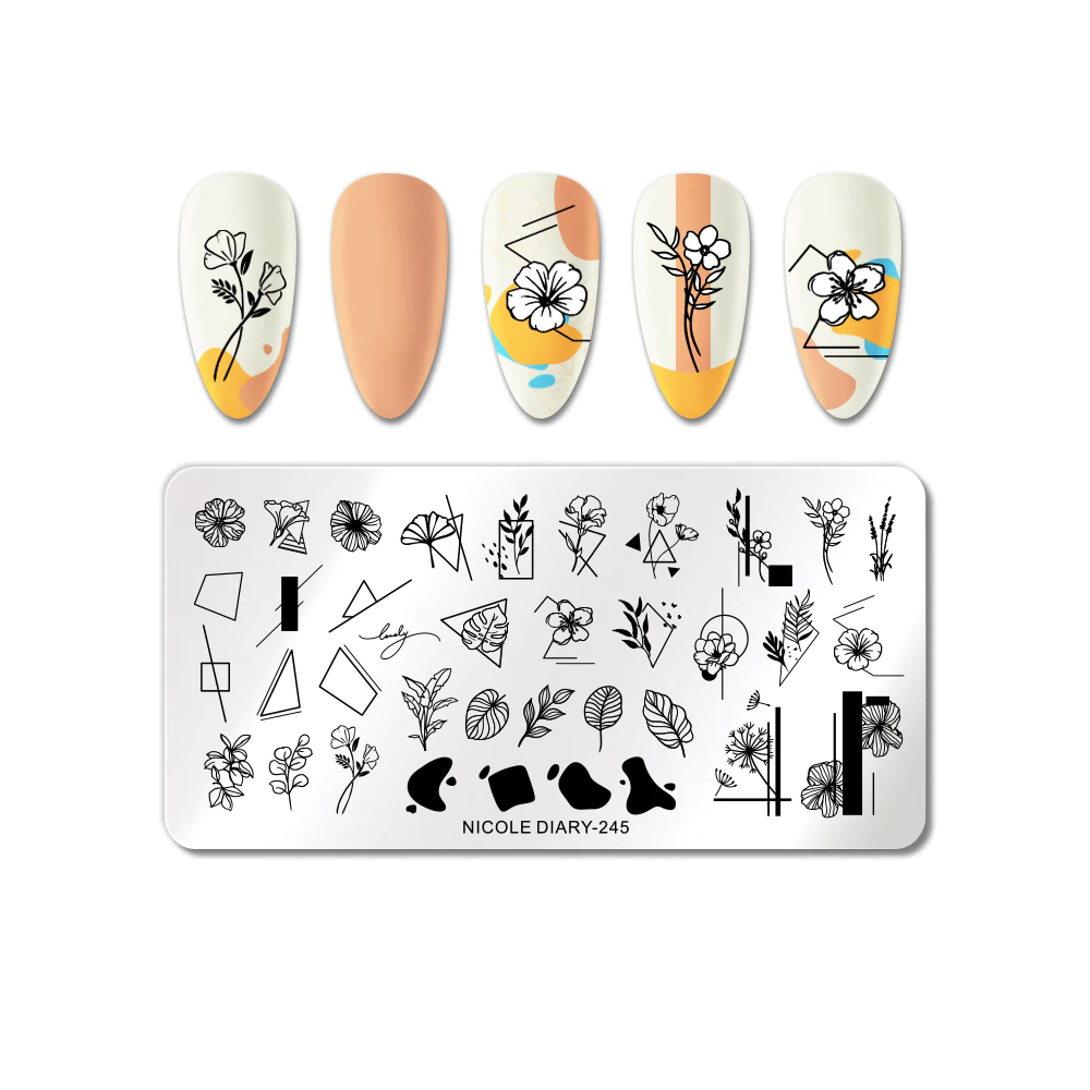 Placa prezinta o varietate de modele metalice, inclusiv forme geometrice, dungi si desene abstracte, permitandu-va sa creati posibilitati infinite de nail art.