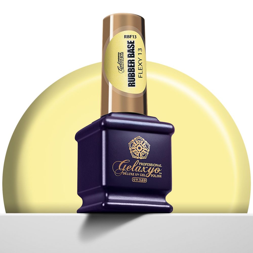 Gelaxyo Rubber Base Flexy - 13 este o bază cu nuanță galben pal, cauciucată, pentru oja semipermanentă sau gel UV. Asigură o aderență maximă la unghia naturală, garantând rezistența pe unghii până la 6 săptămâni.