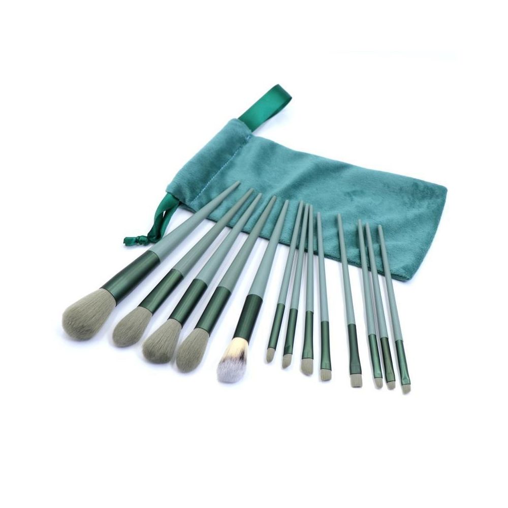 Set 13 Pensule Profesionale Pentru Machiaj cu Saculet din Catifea, Verde