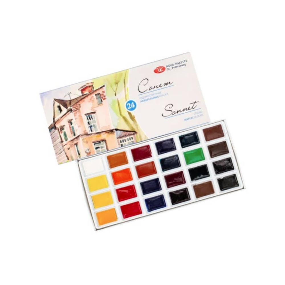Setul de 24 acuarele rusesti Sonnet contine urmatoarele culori: titanium white, hanza lemon, yellow medium, yellow deep, gold ochre, orange, red light, carmine,