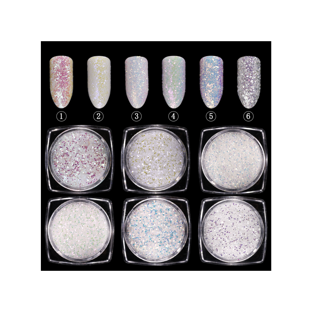 Acest set este format din 6 cutiute in care se afla nuante diferite de sclipici. Datorita acestui aspect, poti alege sclipiciul care se potriveste cel mai bine cu manichiura!