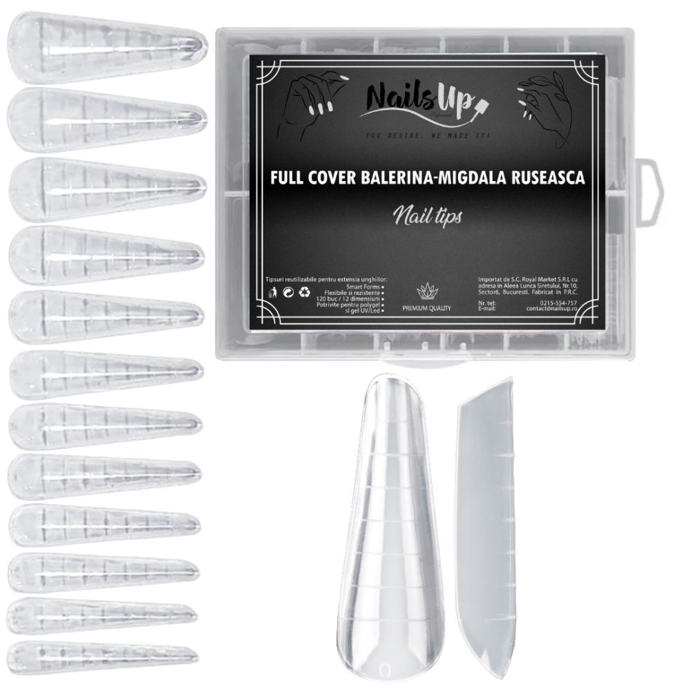 Tipsuri Full Cover Balerina - Migdala Ruseasca NailsUp este un set de tipsuri, care are 12 marimi destinate realizarii manichiurii in forma de balerina si migdala ruseasca! Avantajul utilizarii Tipsuri Full Cover Balerina - Migdala Ruseasca NailsUp este reutilizarea! Acestea se pot refolosi, dar este indicat sa le intretinem corespunzator!
