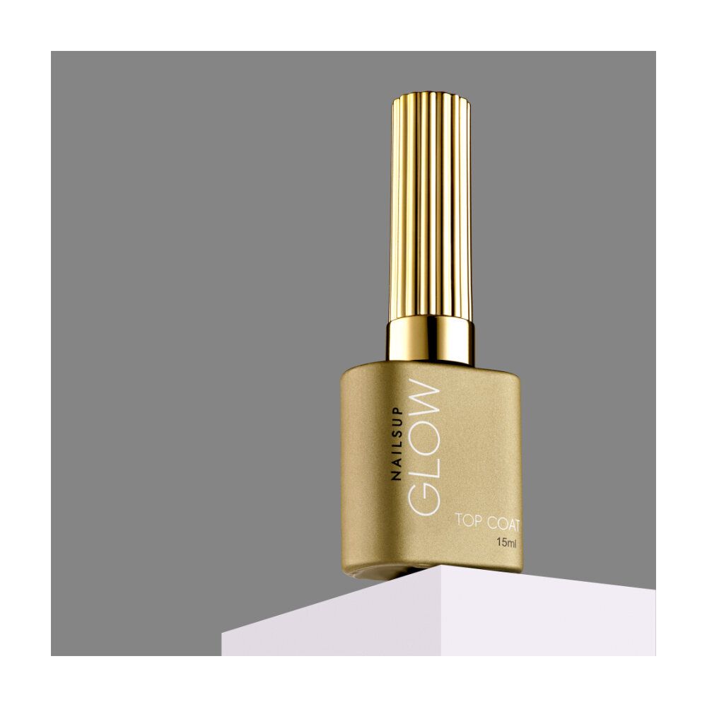 Un top coat UV/LED fără strat lipicios („no-wipe”) în flacon de 15 ml, din gama Glow de la NailsUp, destinat să ofere strălucire intensă și rezistență fără necesitatea dezlipirii finale.